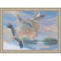 Protected by a graceful flamingo, a young girl sleeps and dreams. Your Counted Cross Stitch kit includes 14-count grey Zweigart Aida fabric, pre-sorted DMC cotton thread, needle, chart and instructions. 31 x 25 cm