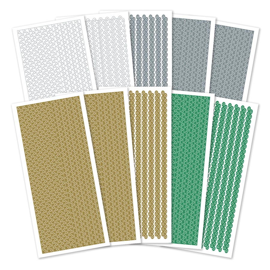 10 assorted border ribbon stickers in green, gold and silver. 10 x 23 cm.